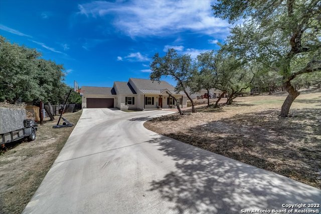 TIMBERWOOD PARK CUSTOM BULIT ON OVER A HALF ACRE LOT! 4 bed 3 bath house. Private second master, mother-in-law, nanny quarters with outside access from main house.Used to be music room area. Ranch /farm House style.Open floor plan with HIGH ceilings. Spli plan with master on the opposite side of the other 2 bedrooms. Your new office/study room sits in the front next to the entry and looks out past the covered front porch! Beautiful rock fireplace extends floor to ceiling with open timbers and true 3cm granite counter tops. Custom cabinets throughout home including soft close glides drawers, pull outs, wine cooler;built in garbage bin, composite sink, fridge, flat top range & microwave. Master bedroom has exclusive entry/exit onto covered private patio that is over 45' long. Additionally a slab with water and electric stubbed-in is 11x17 for a She Shed, Man Cave, Shop, Pool Room, Out Door Kitchen can be finished easily( all the ground work is complete). Home is wired for smart home capability with fiberoptic trunk including 2 water heaters. All of this nestled into a .66 acre lot in Timberwood Park boasting wildlife and incredible amenities at the HOA recreation area. Best neighboorhood ammneties for all your gatherings and special events.